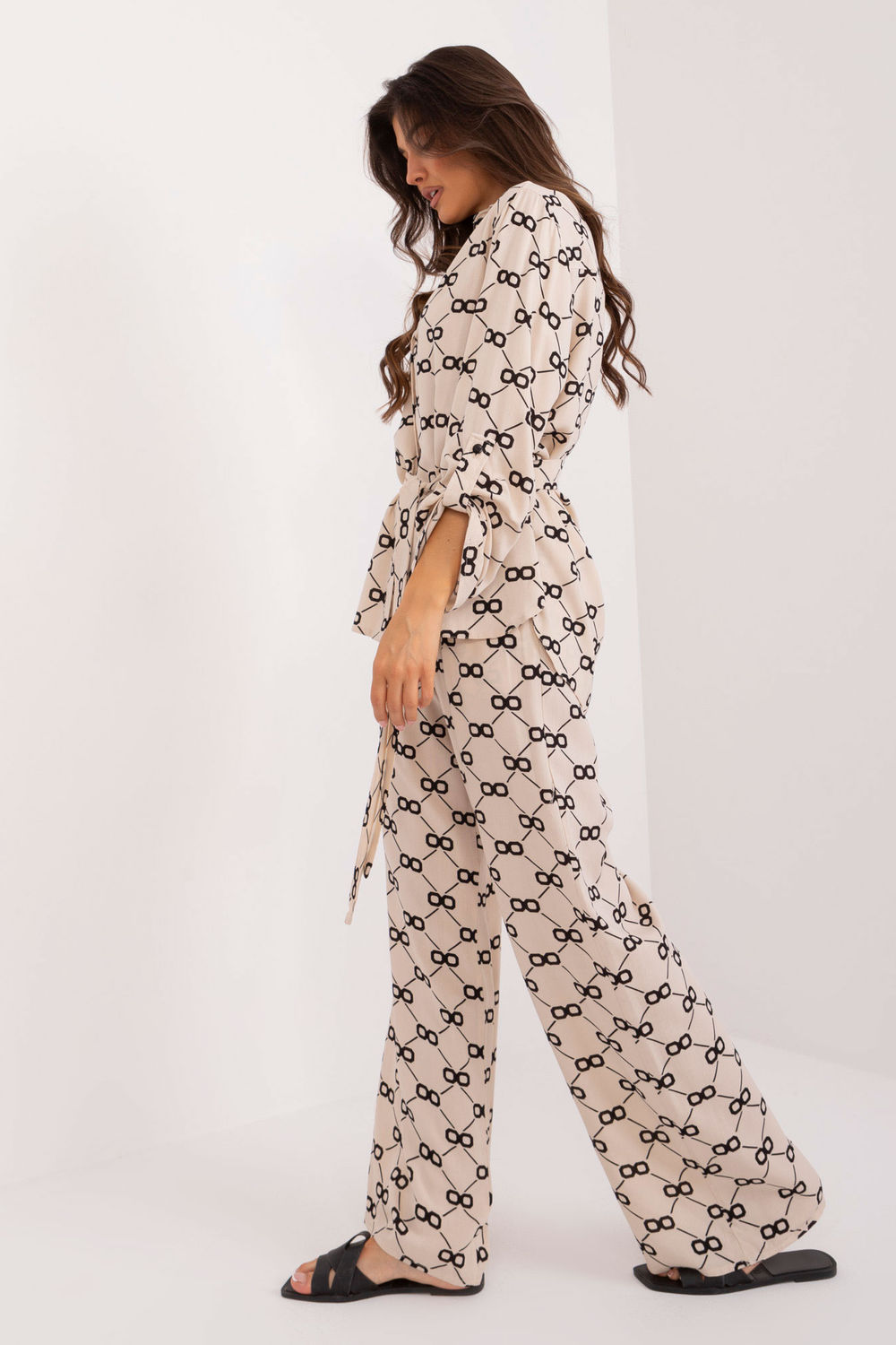 Discover a summer women’s set consisting of an elegant shirt and comfortable trousers. This set is a perfect choice for everyday outings, offering a combination of comfort and style. The elegant shirt is buttoned, making it easy to put on and take off. An additional belt for tying at the waist accentuates the silhouette and adds charm. The shirt has long sleeves, making it suitable for cooler days. The classic collar adds a formal character to the shirt, which perfectly balances with its casual style. The trousers are equipped with a waist tie, allowing for a perfect fit to the silhouette. The straight legs make the trousers versatile and suitable for many stylings. The high waist ensures comfort and accentuates the waist. Practical, slip-in side pockets add functionality and comfort. The set is decorated with an original print that catches the eye and adds freshness to every outfit.