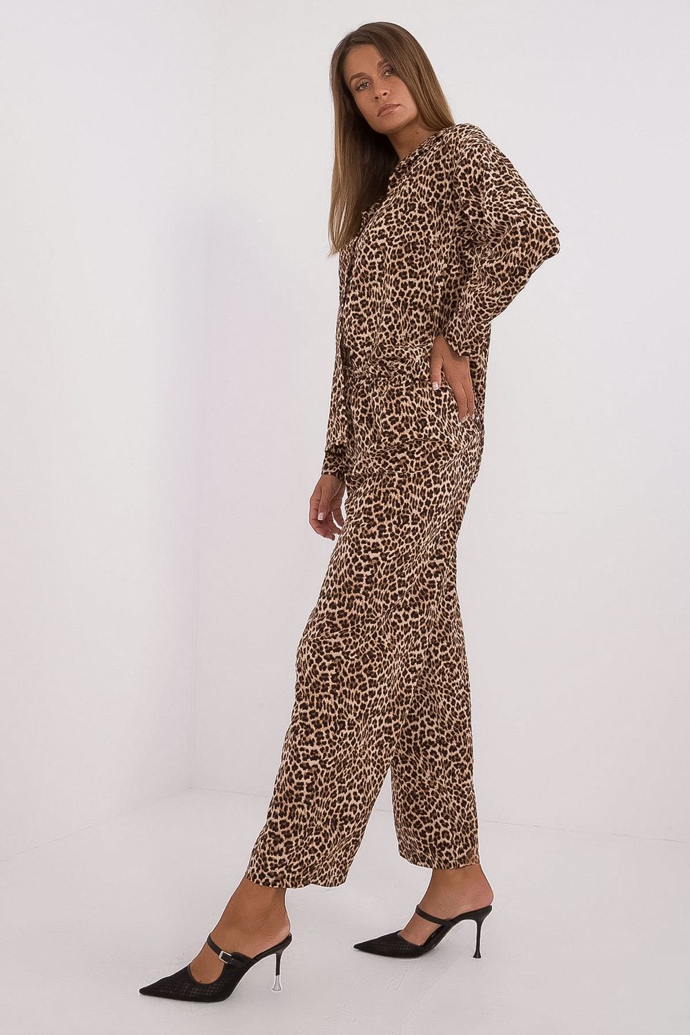 Women’s set with a trendy animal motif, consisting of a shirt and pants, made of a combination of polyester and elastane. The shirt has long sleeves and is buttoned up, giving it a classic character. Additionally, it is equipped with a collar, which emphasizes the elegant look. The pants are long with wide legs, which provide comfort and freedom of movement. The high waist of the pants beautifully accentuates the silhouette, adding refinement to the whole outfit. This set is an ideal choice for women who value fashion, comfort, and a touch of predatory style in their everyday wear.