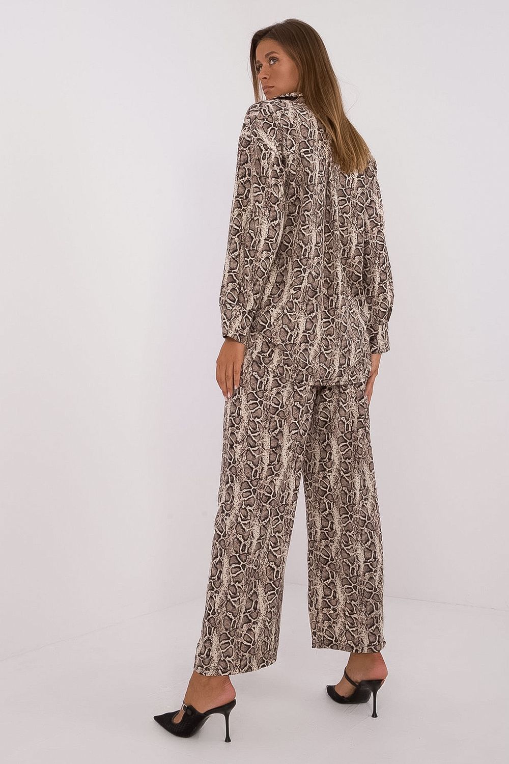 Women’s set with a fashionable animal motif, consisting of a shirt and pants, made of a combination of polyester and elastane. The shirt has long sleeves and is buttoned up, giving it a classic character. Additionally, it is equipped with a collar, which emphasizes its elegant appearance. The pants are long, with wide legs that provide comfort and freedom of movement. The high waist of the pants beautifully accentuates the silhouette, adding refinement to the overall look. This set is an ideal choice for women who appreciate fashion, comfort, and a bit of a predatory style for everyday wear.