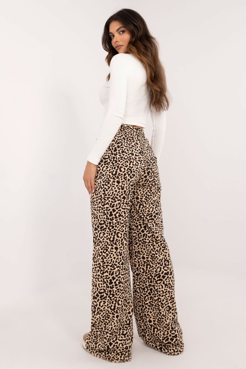 Women’s casual style set, ideal for everyday styling. Made of cotton with added elastane, it provides comfort and freedom of movement. The blouse, made of ribbed material, has long sleeves and a round neckline, with a small, subtle inscription on the front. The high-waisted pants have wide legs for added elegance, and side slip pockets for practicality. The predominant animal motif on the pants gives the overall look a fashionable and bold touch. This is a stylish and comfortable choice for everyday wear, combining comfort with distinctive design.