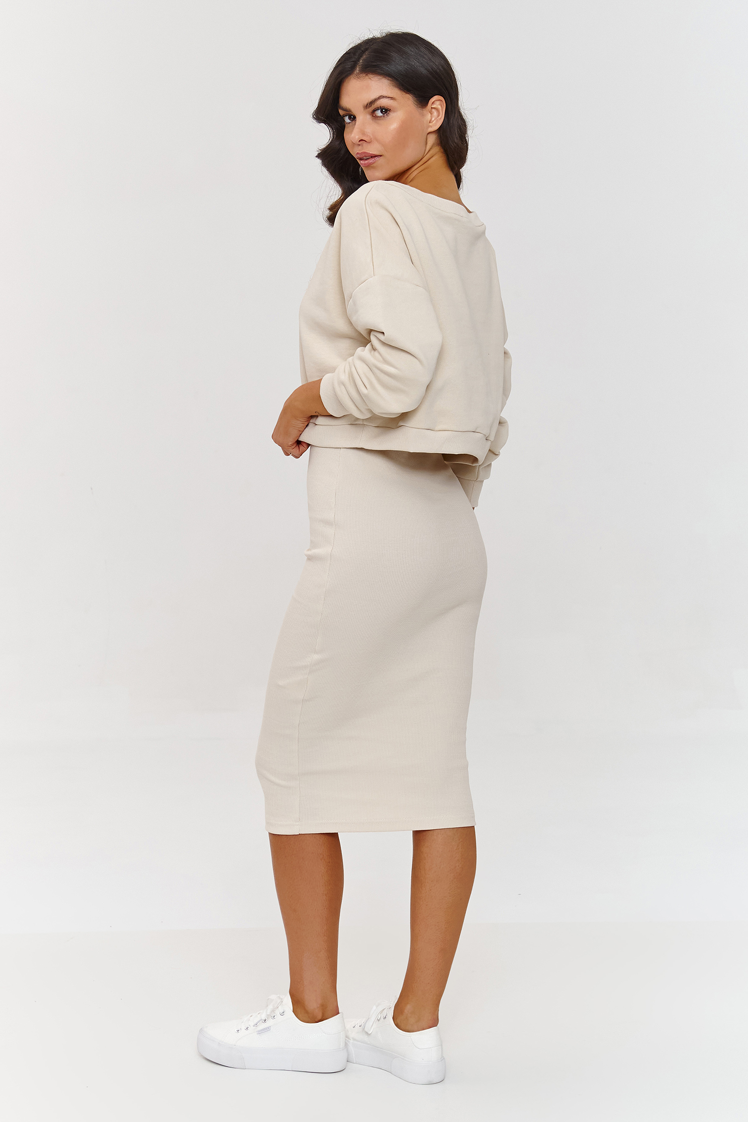 This tracksuit is a proposal for women who appreciate style with a hint of comfort. The simple cut and versatile form of the dress perfectly accentuate the silhouette. Thanks to the ribbed structure of the material, it is both elastic and compact, providing full freedom of movement. The midi length is a classic in fashion, which additionally emphasizes elegance and never goes out of style. The loose cut of the sweatshirt and the V-neckline give it a casual yet stylish character. Sleeves finished with ribbing allow for adjusting their length, and the short waistband fits perfectly with the dress, adding lightness to it. The loose sweatshirt and fitted dress create a fashionable yet practical look that is suitable for both everyday meetings and more relaxing days at home.