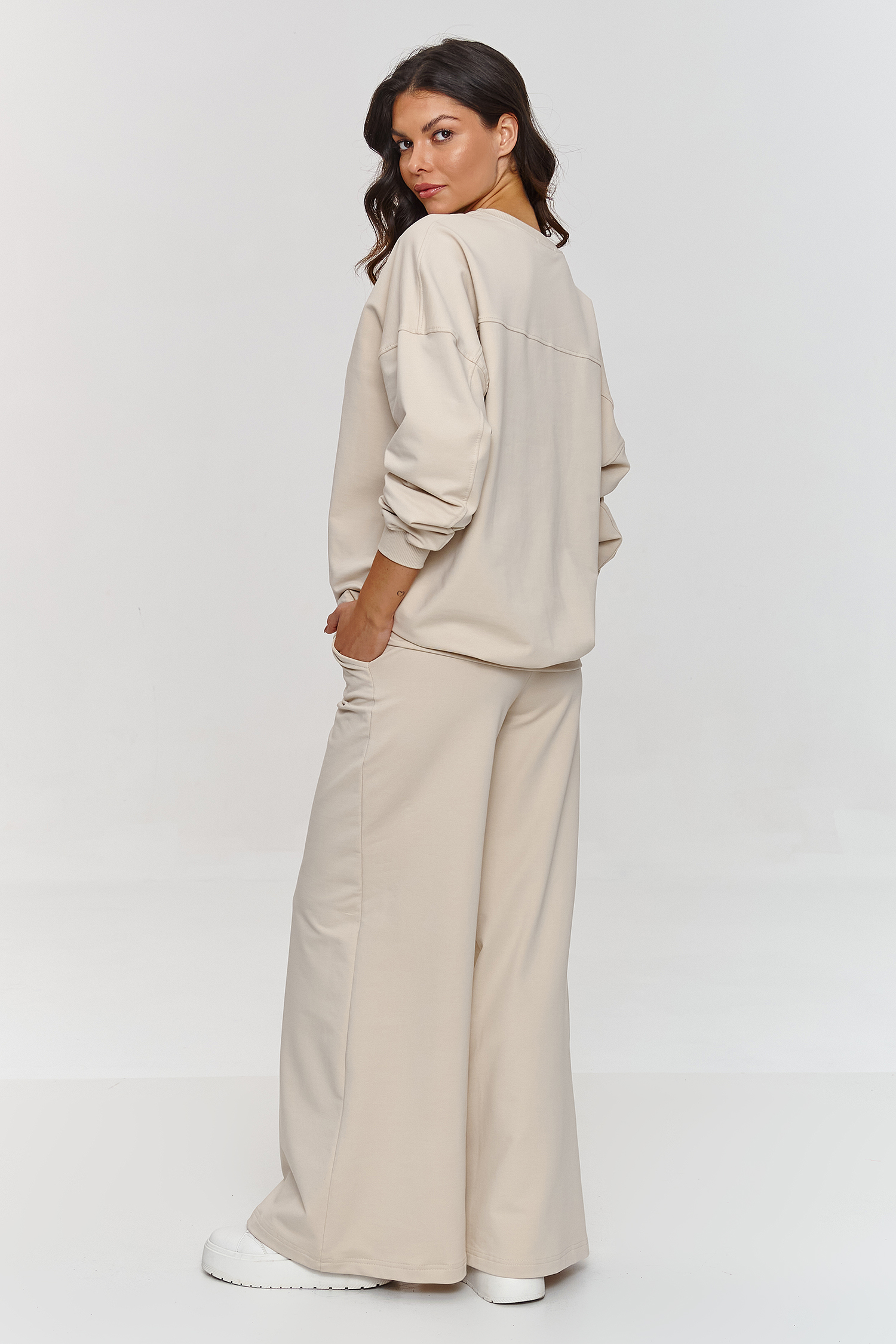 This tracksuit set is the perfect choice for women who value functionality and style. The set consists of an oversized sweatshirt with long sleeves and loose pants that create a comfortable, yet stylish look. Thanks to the wide cut, the pants provide full freedom of movement, and the elastic waistband adjusts to the silhouette. Additionally, they flare out at the bottom, giving the set a unique and dynamic character. The sweatshirt with a classic round neckline and ribbed cuffs on the sleeves completes the look, creating a comfortable and interesting set. The tracksuit is made of soft and pleasant to the touch sweatshirt material, which ensures comfort every day. Thanks to the simple yet stylish cut, the set will work well in various situations. Our tracksuit set is a choice that combines comfort, functionality, and a modern look. It will be perfect for relaxing at home, meeting friends, shopping, or everyday wear. The set pairs perfectly with your favorite sneakers, creating a stylish, comfortable, and fashionable outfit.