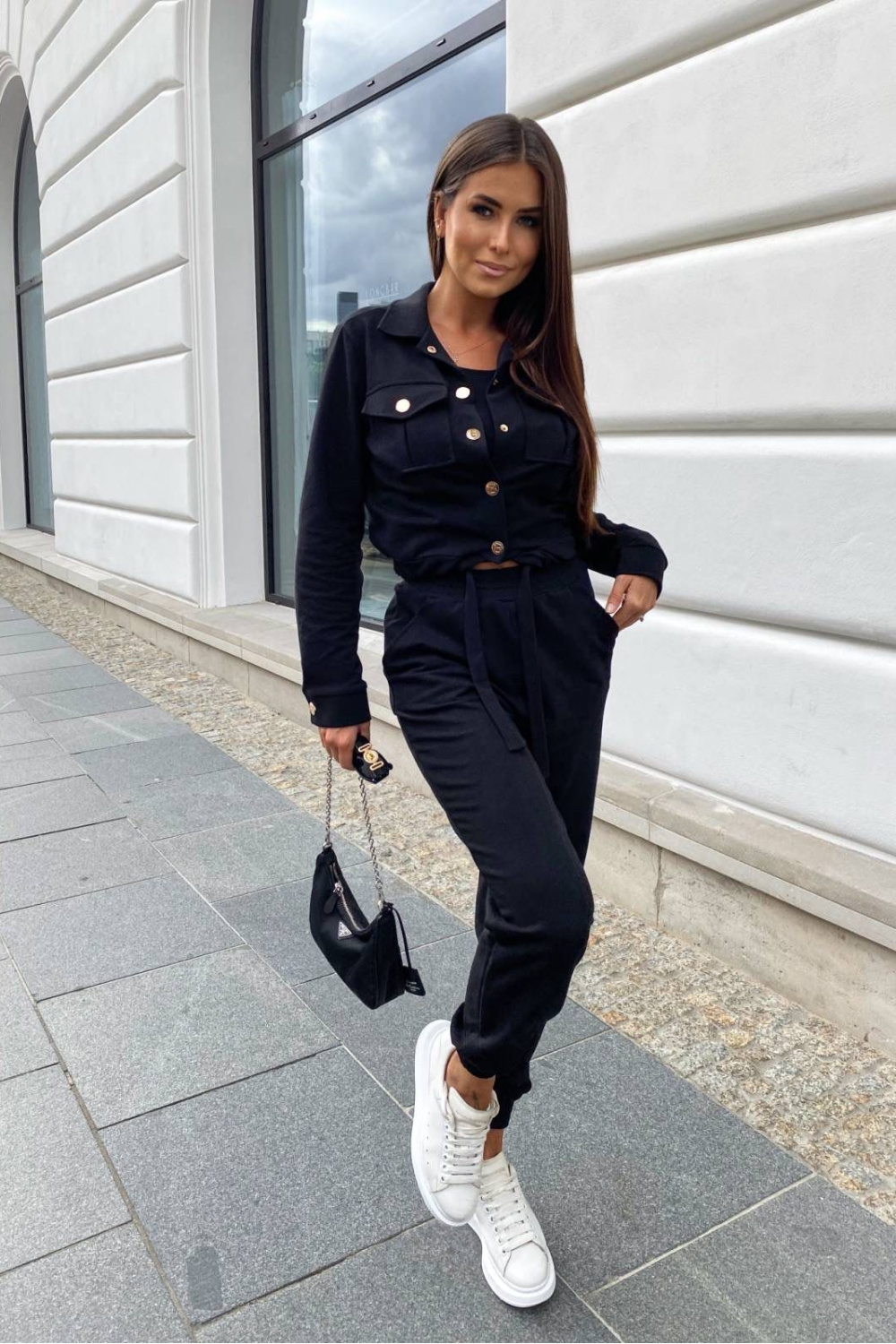 We present a three-piece Milano tracksuit set in black, perfect for everyday styling and sports activities. The set includes a t-shirt, a hoodie, and pants, which provide not only comfort but also a fashionable look. The tank top has a round neckline. The hoodie has long sleeves, a collar, and snaps for closure. At the bottom of the hoodie, there is an additional tie to better adjust the fit. The long pants have slip pockets and an elastic waistband. All elements of the set are made of high-quality 100% cotton, which ensures comfort even when worn all day. The Milano set is an excellent choice for women who value style and comfort.