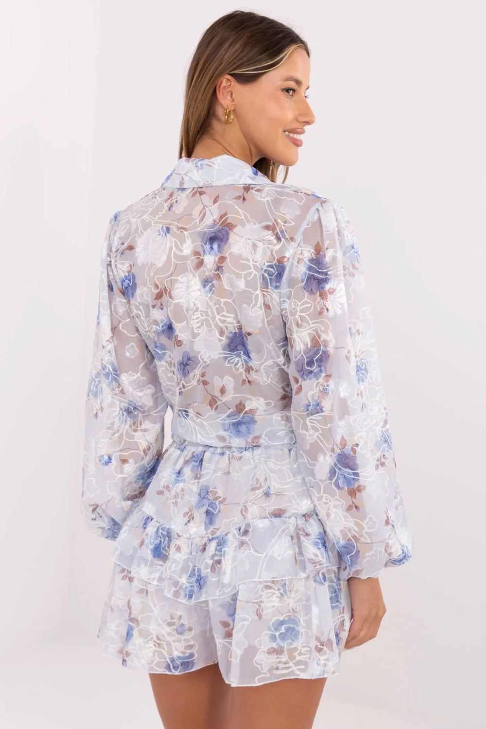 Stylish set consisting of a buttoned shirt and a skirt-trousers is a unique proposition for women who appreciate elegance with a hint of romance. Made of high-quality material with a floral pattern and decorative embroidery, it combines cotton, elastane, and polyester, guaranteeing comfort, breathability, and perfect fit. The shirt has long, slightly puffy sleeves with cuffed cuffs, and its neckline is finished with a classic collar. A delicate ruffle adds feminine charm and lightness to the whole. The skirt-trousers with a short length and wide legs are designed with a high waist, beautifully emphasizing the waist and elongating the silhouette. For additional comfort, they are lined, and the lack of pockets allows you to maintain a slim, elegant fit. This set will work great both for everyday wear and for formal occasions, just pair it with classic shoes and subtle jewelry to create a unique look.