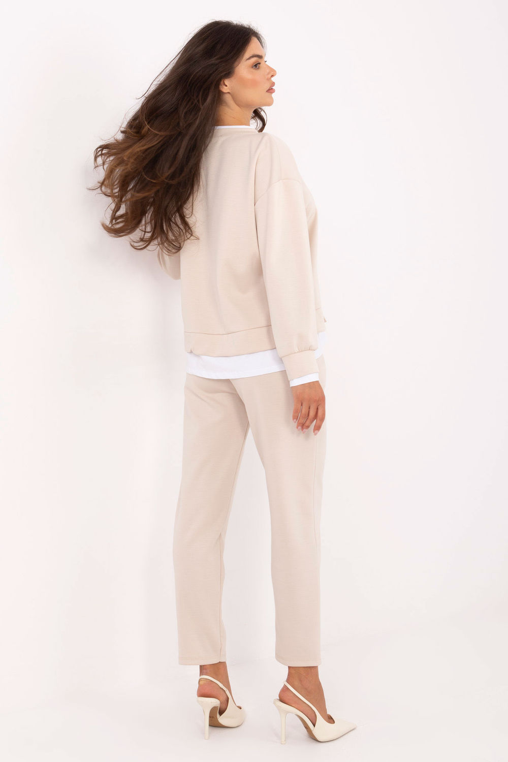 Women’s casual set made of a soft, delicate and exceptionally pleasant to the touch material. The set consists of a sweatshirt with a round neckline and high-waisted pants, creating a comfortable and stylish everyday look. The sweatshirt has long sleeves, neckline, and hem lined with contrasting fabric and a subtle patch. The pants with straight legs are equipped with a high waist with a tie and side pockets, providing comfort and a modern silhouette. The smooth pattern and the combination of viscose with elastane guarantee softness, flexibility, and freedom of movement. This set is perfect for everyday outings, combining comfort, elegance, and casual style.