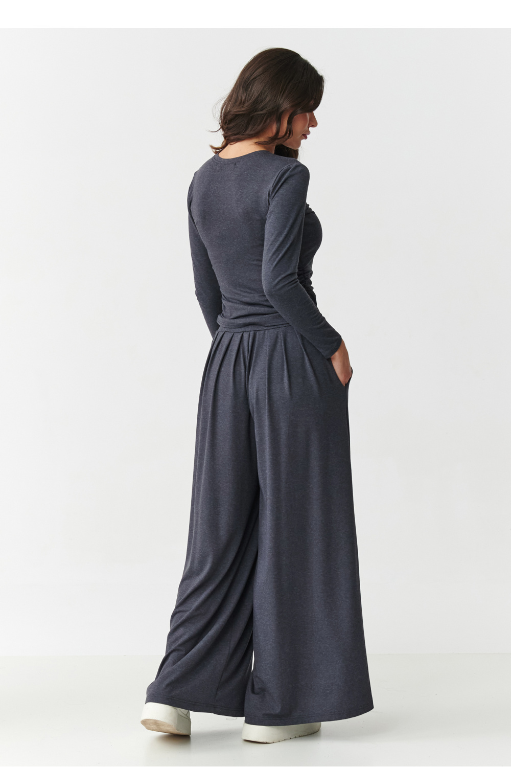 This set is the perfect proposal for women who are looking for a combination of comfort, style, and delicacy. Made of soft, pleasant to the touch viscose, it perfectly fits the silhouette, providing freedom of movement and comfort throughout the day. The top of the set is a fitted blouse with long sleeves, which stands out with subtle gathering on the sides. This feminine detail not only accentuates the waist, but also gives the whole an elegant, yet casual character. The combination of simplicity with a trendy detail makes the blouse not only perfect as part of the set, but also solo in many stylizations. Wide, loosely fitting trousers guarantee comfort and style in one. Thanks to the elastic waist and loose cut, they work great in movement, and the side pockets add functionality. This is the perfect style for wearing at home, as well as in street stylizations. The women’s set is available in fashionable, universal colors: anthracite, black, chocolate, khaki, and burgundy. Choose comfort that goes hand in hand with a feminine look, choose a viscose set that will fit your lifestyle and silhouette.
