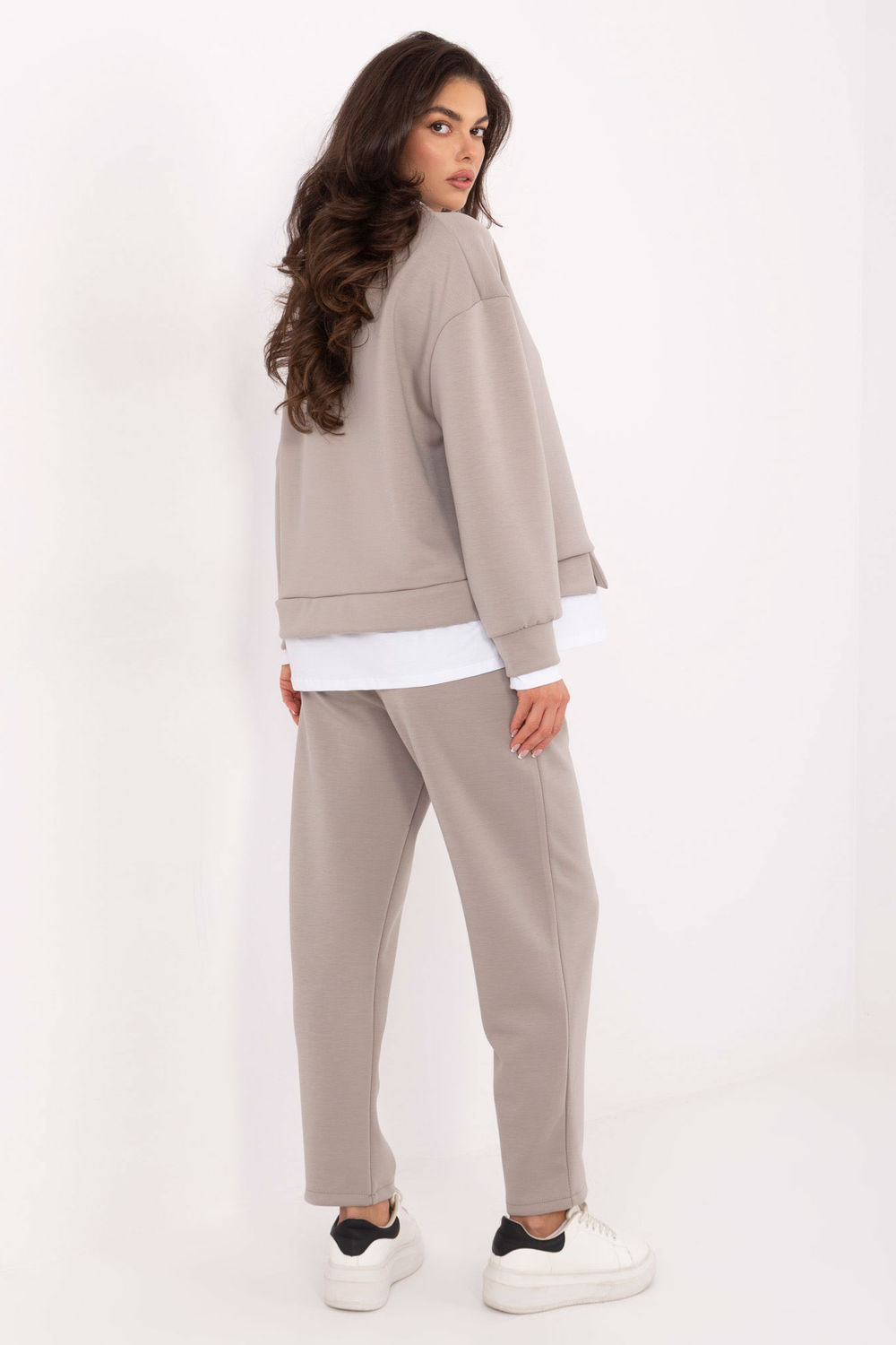 Women’s casual set made of soft, delicate and exceptionally pleasant to the touch buttery material. The set consists of a sweatshirt with a round neckline and high-waisted trousers, creating a comfortable and stylish everyday look. The sweatshirt has long sleeves, neckline and bottom lined with contrasting fabric and a subtle patch. The trousers with straight legs are equipped with a high waist with a tie and side pockets, providing comfort and a modern cut. The smooth pattern and the combination of viscose with elastane guarantee softness, flexibility and freedom of movement. This set is perfect for everyday outings, combining comfort, elegance and casual style.