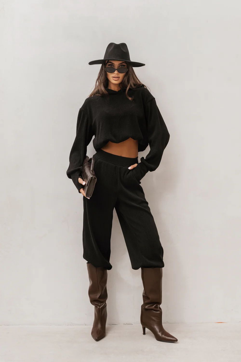 We present the HOPE set in an elegant shade of black, perfect for those who value both comfort and style. This unique clothing combination combines trendy design with practicality, making it a perfect choice for any occasion. It will work both for everyday wear and for more formal outings. The set consists of a sweatshirt and trousers that harmonize perfectly with each other. The sweatshirt stands out with a simple yet elegant cut, providing freedom of movement. The trousers, on the other hand, have a classic fit that will accentuate any adult silhouette, making it more attractive. Our set is made of high-quality materials: 70% viscose and 30% polyester. This makes the clothing not only pleasant to the touch, but also durable and resistant to damage. Viscose makes the fabric breathable, making it an ideal choice for warmer days, while polyester provides elasticity and ease of care. Our offer combines modernity with classic style, and the HOPE set will surely meet the expectations of even the most demanding customers. Choose freedom, elegance, and quality that will make you feel exceptional in any situation.