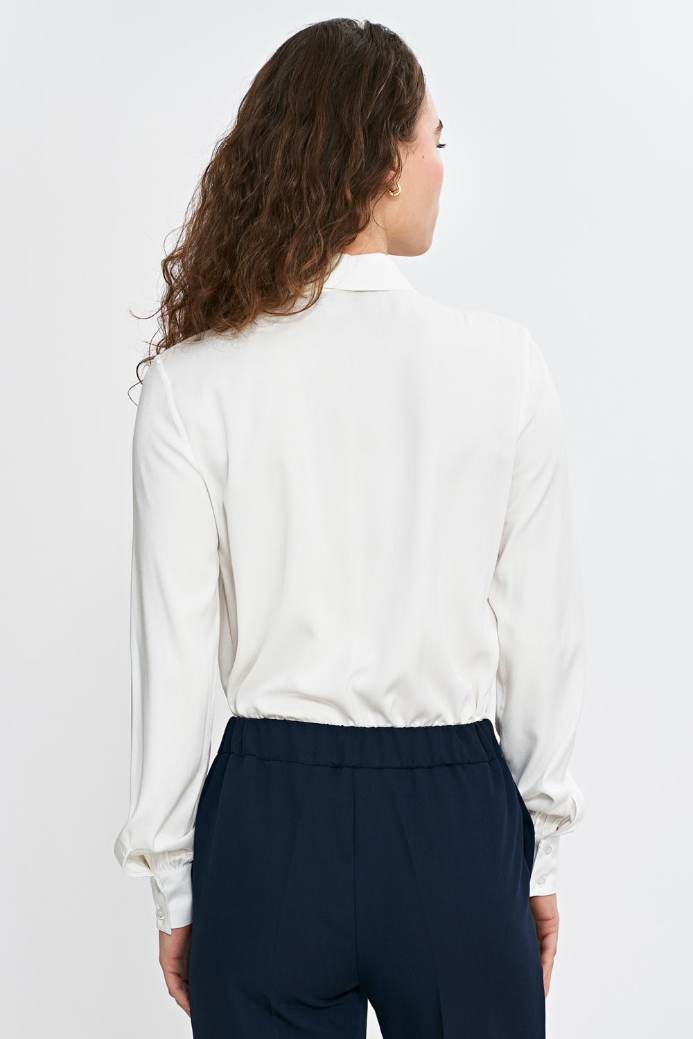 Elegant women’s shirt with a regular cut, made of lightweight and pleasant to the touch viscose material. The classic collar with a sewn-in scarf underneath gives it a subtly feminine, yet elegant character. The long sleeve with a cuff adds a formal accent to the whole. The button closure at the front makes the shirt comfortable and practical. Ideal for the office, business meetings, and elegant outings.