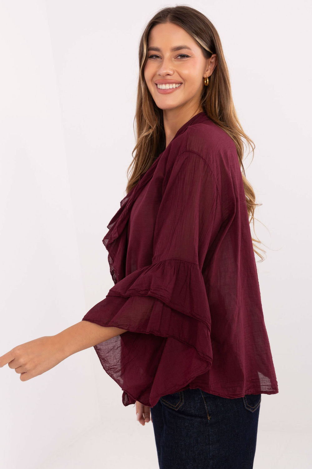 Stylish and feminine classic shirt is a combination of elegance and comfort, perfect for both work and everyday, formal occasions. Made of high-quality cotton, it provides comfort and excellent breathability throughout the day. The standard length model has 3/4 sleeves finished with delicate ruffles, which give it a subtle, romantic character. The round neckline and button closure emphasize the classic style of the shirt, and the jabot on the front is an elegant accent, giving the whole a unique charm. The smooth pattern makes the shirt perfect to pair with elegant trousers, skirt or blazer, creating a stylish set for the office or business meetings.
