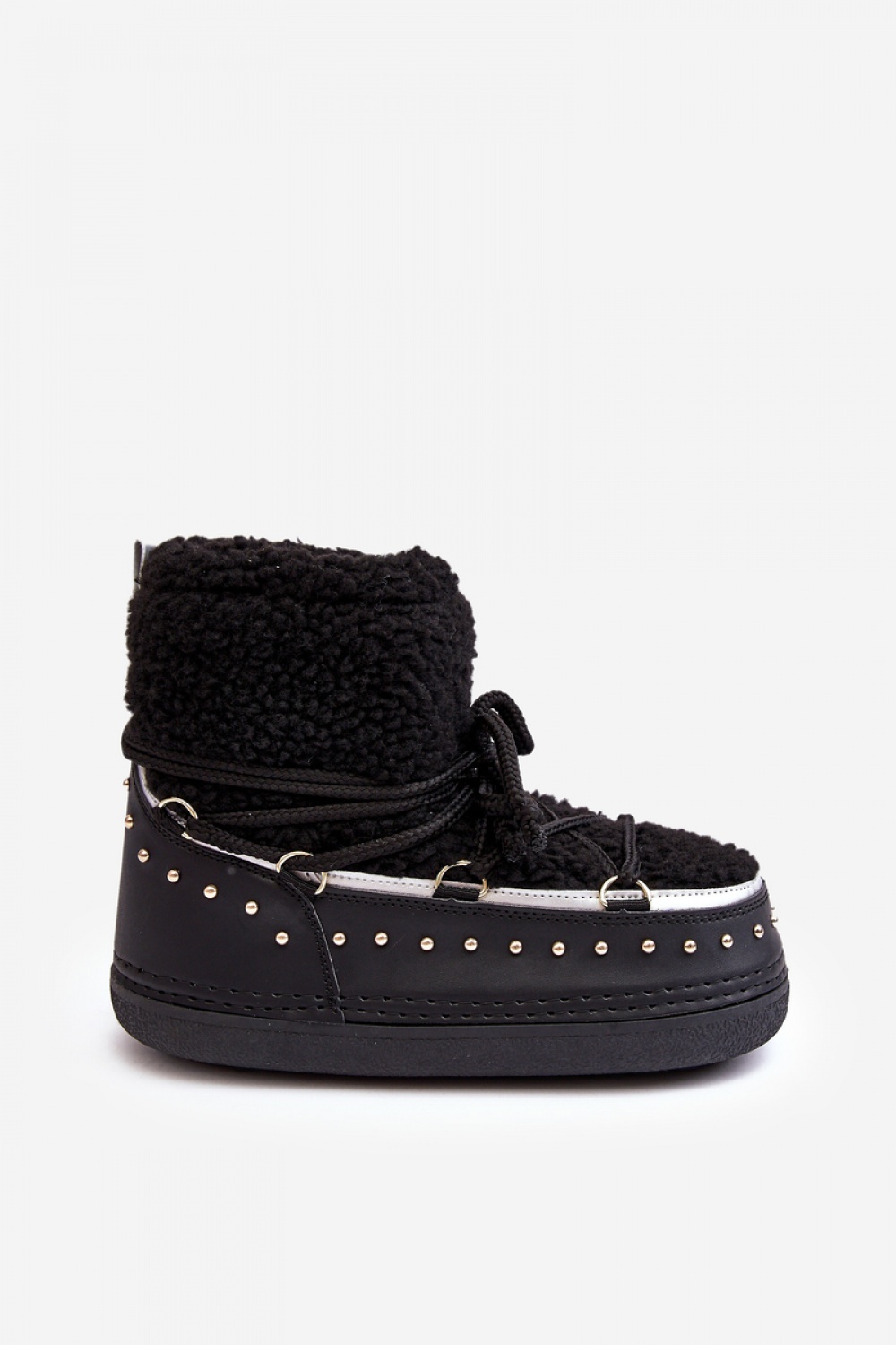 The unique women’s snow boots are made of cold and wind resistant material. The upper with artificial sheepskin and studs will be perfect for the autumn-winter season. The model is classically slip-on with additional lacing. The snow boots are set on a massive platform. They have insulating foam and shoe blanket inside, which provide high protection on cold days.