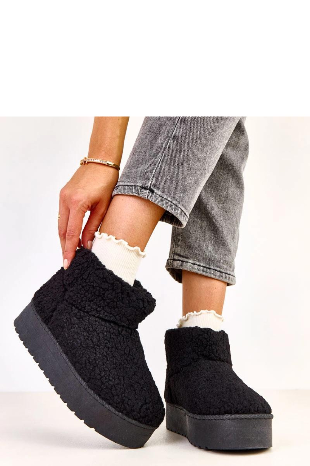 Slip-on snow boots with synthetic fur are the perfect combination of warmth and comfort for winter days. Made of soft synthetic fur of the sheepskin type, they provide a cozy feeling and excellent insulation against the cold. The model has a round toe and is additionally lined with fur, so the foot remains dry and warm even in low temperatures. The 4 cm high platform stabilizes the step, and the fabric insole guarantees comfort throughout the day. Thanks to the slip-on construction, the snow boots are quick and easy to put on.