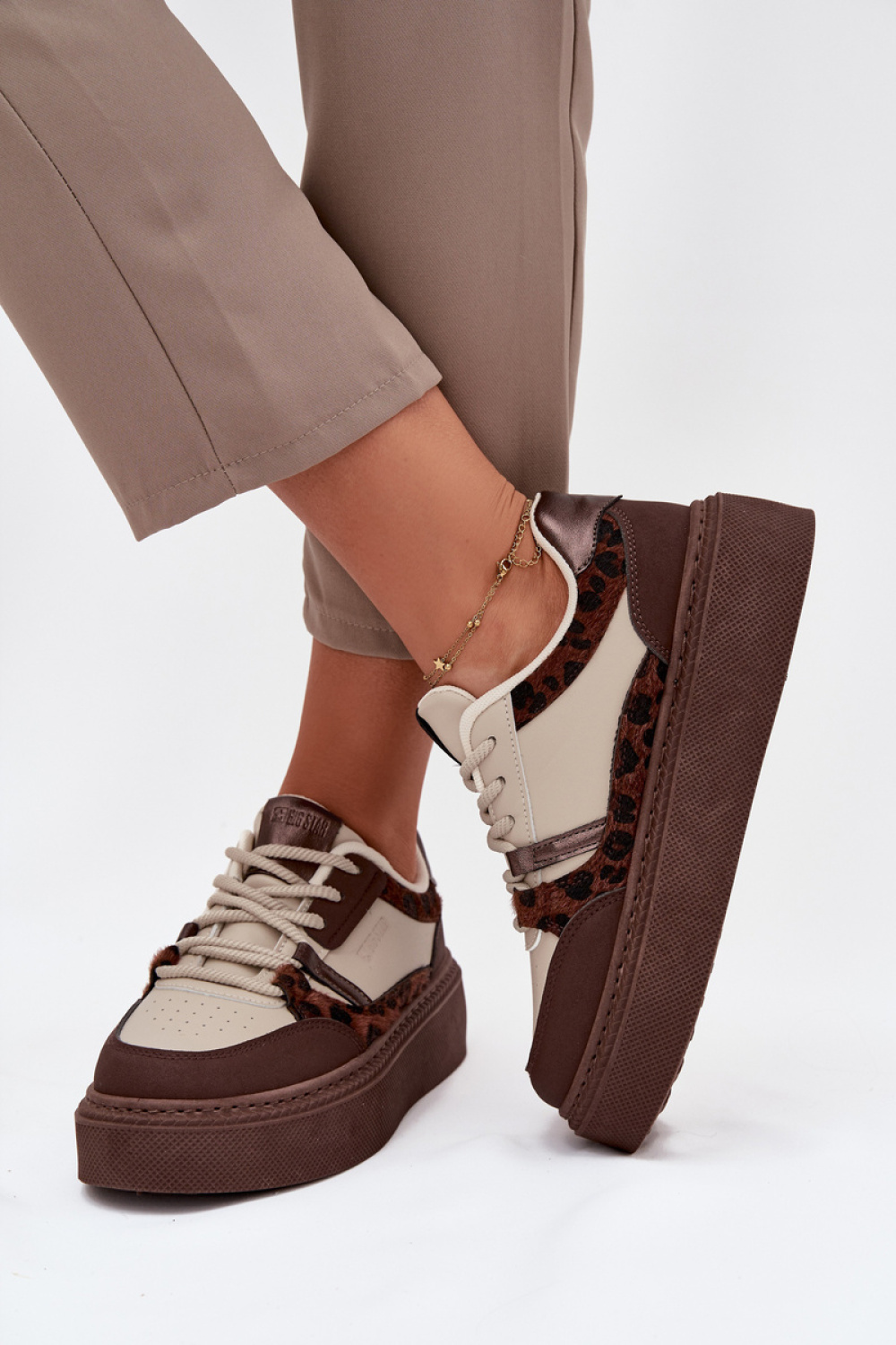 Women’s sneakers from Big Star. Made of eco leather, set on a platform that adds height and slims the silhouette. Soft insole provides comfort throughout the day, and classic lacing allows for a perfect fit. Perfect for everyday styling, these sneakers will be a great addition to any wardrobe, adding lightness and style.