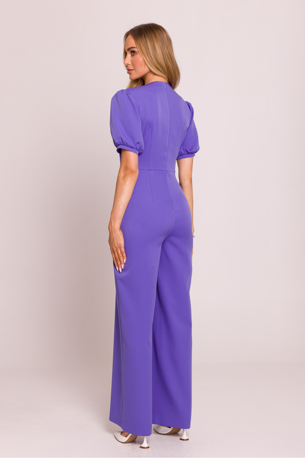 Stylish jumpsuit with a feminine cut, made of high-quality fabric. The deep V-neck beautifully emphasizes the neck and cleavage, while the accentuated waist highlights the silhouette. Short puff sleeves with cuffs add a romantic touch, and slightly flared legs with pleats from the waist ensure an elegant and casual look. The model is fastened with a concealed zipper at the back, with the top lined for greater comfort. The whole designed and sewn in Poland with attention to every detail.