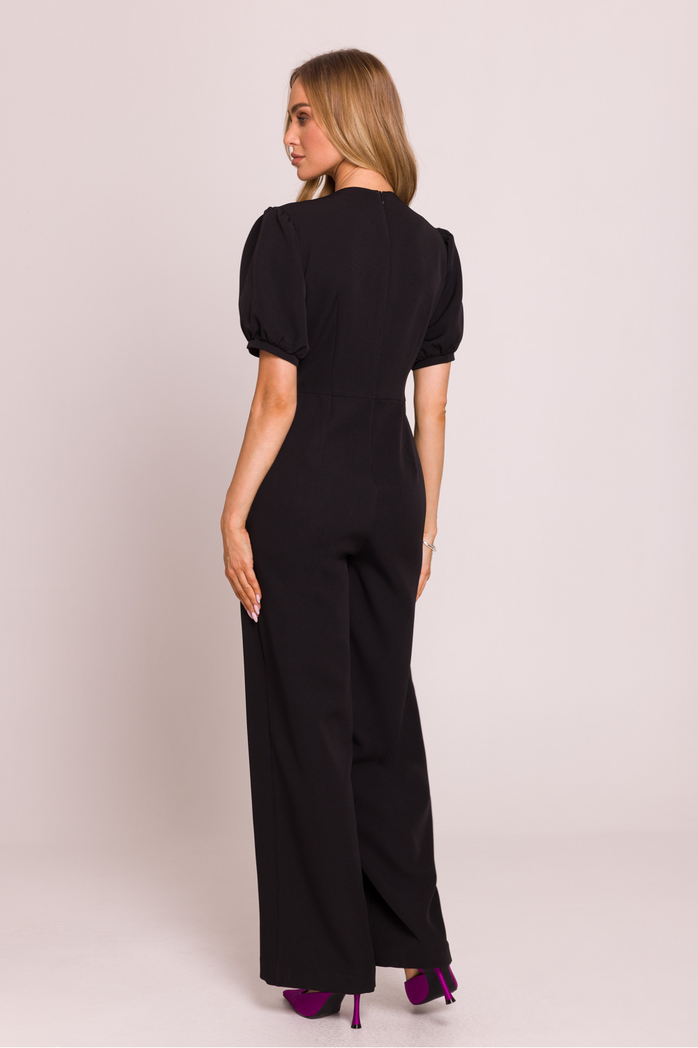 Stylish jumpsuit with a feminine cut, made of high-quality fabric. The deep V-neck beautifully accentuates the neck and décolletage, while the emphasized waist highlights the silhouette. Short puffed sleeves with cuffs add a romantic touch, and slightly widened pants with pleats from the waist provide an elegant and casual look. The model is fastened with a concealed zipper at the back, with the top lined for greater comfort. The whole outfit is designed and sewn in Poland with attention to every detail.