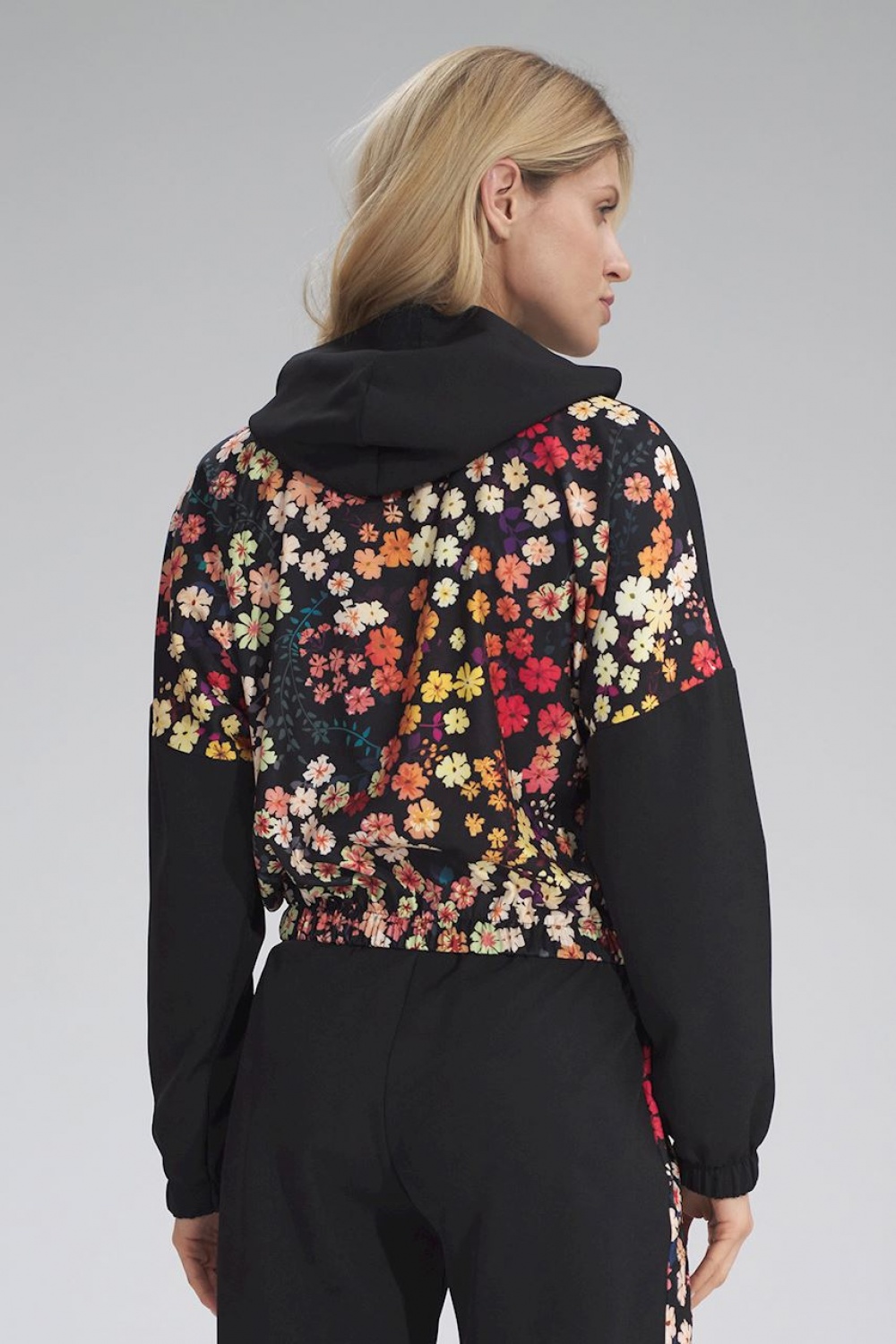 Short two-coloured hoodie with a striped pattern at the bust, sleeves and bottom hem finished with a wide elastic band.