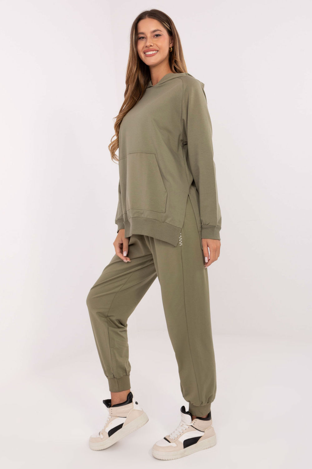 Oversize women’s sweatshirt in a casual style, perfect for everyday occasions. Made of cotton with elastane, it is soft, comfortable and pleasant to wear. The smooth pattern makes it easy to match to different stylings. Model of standard length with a hood and long sleeves. There is a practical kangaroo pocket on the front, and side slits give the sweatshirt lightness and a fashionable character. It is the perfect choice for women who value comfort combined with modern style.