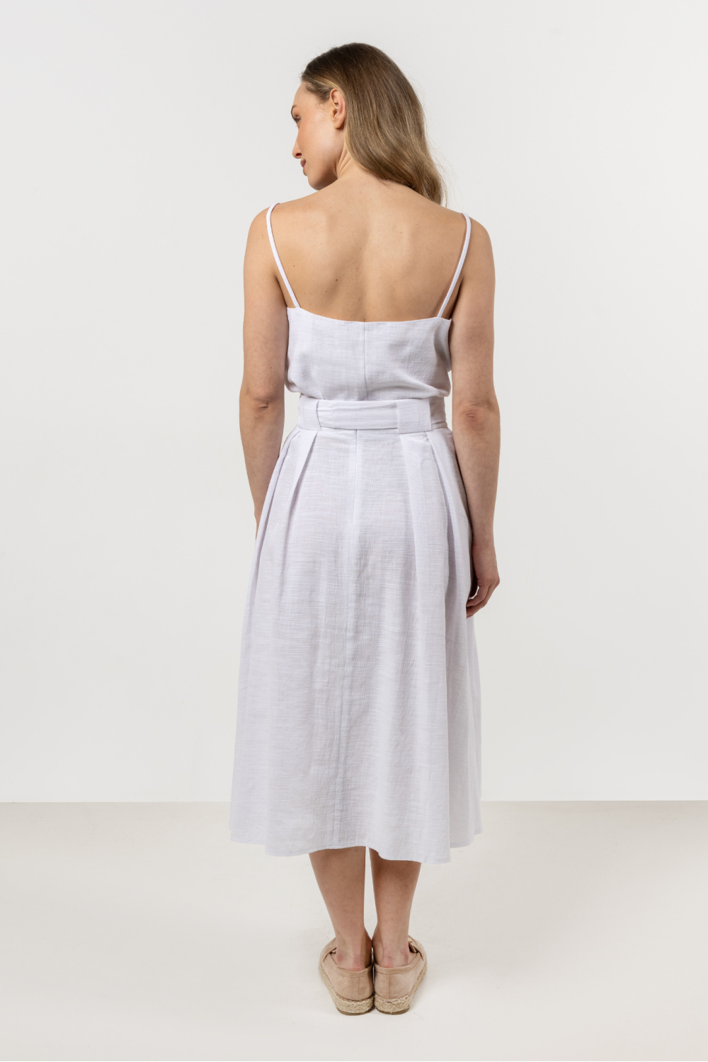 Minimalistic and universal, this top is a must-have for warm days. Made from natural, soft cotton, it ensures breathability and comfort while wearing. The thin straps subtly highlight the shoulders, and the hip-length design makes it perfect for pairing with both skirts and pants. It works great in both casual and elegant outfits. Pair the top with a skirt made from the same fabric or with bermuda shorts. You will create a comfortable summer set.