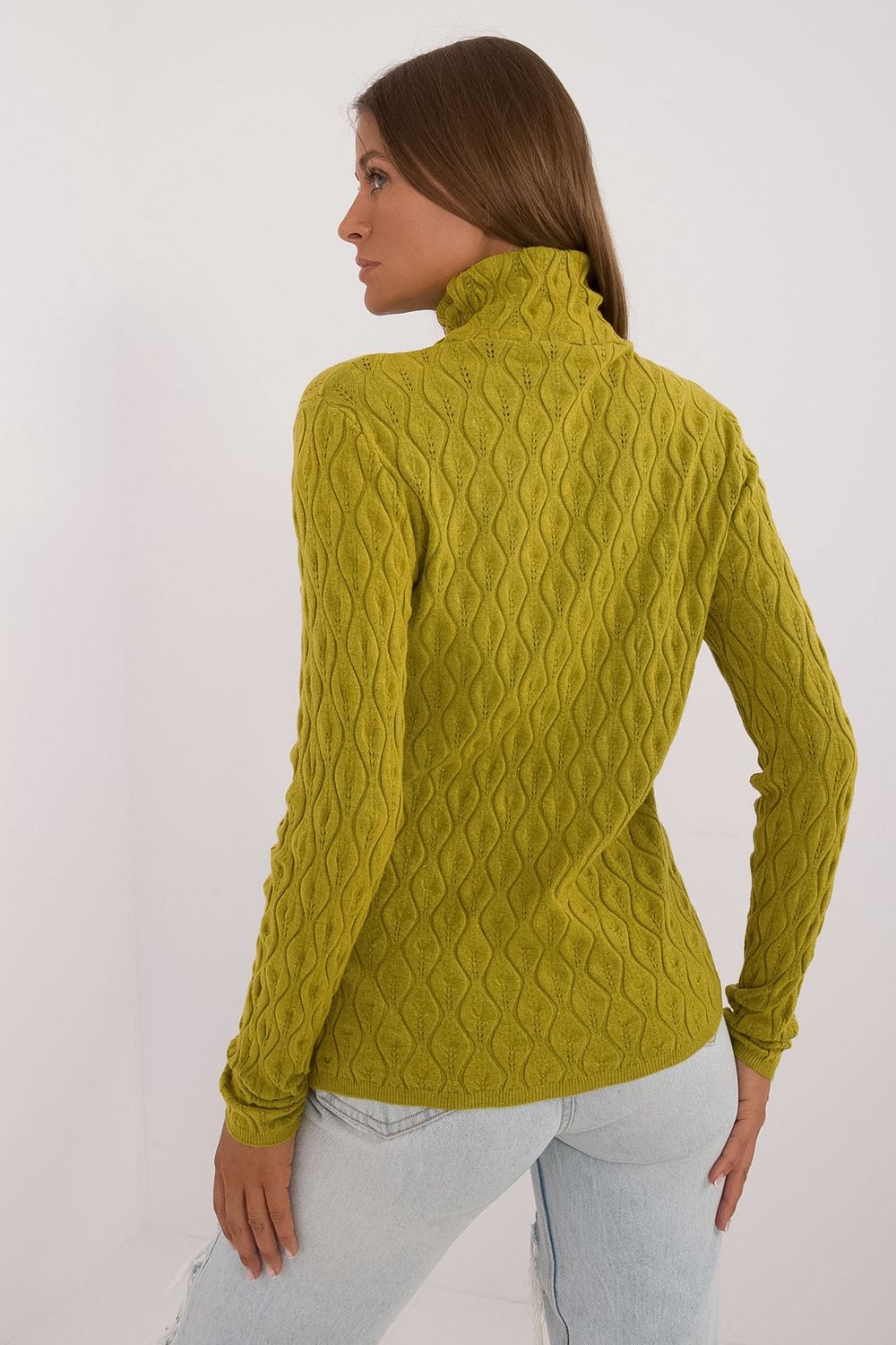 Casual sweater with a turtleneck in a unique, lacy pattern, perfect for everyday wear and work. Made of soft viscose with additives, providing comfort and subtle fit. Standard length and long sleeves make it a versatile wardrobe piece, and the delicate, shiny thread woven into the fabric adds an elegant character to it. Without fastening, the sweater has a minimalist cut that can easily be matched to different styles, adding a touch of elegance and uniqueness to them.