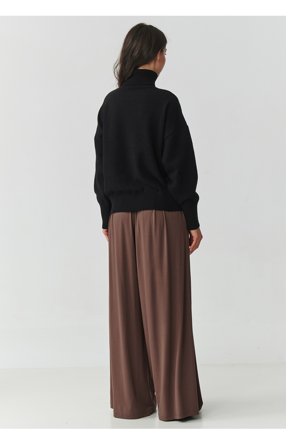 Invest in elegance and comfort at its best. This women’s turtleneck sweater is a must-have in every wardrobe. Made of high-quality fabric with a unique composition of 51% viscose, 30% PBT, and 19% nylon, it impresses with softness, elasticity, and durability. Thanks to the predominance of viscose, the sweater is extremely pleasant to the touch, allows the skin to breathe, and beautifully shapes the silhouette. The addition of synthetic fibers ensures that the material does not distort, maintains its shape even after many washes, and does not pill, guaranteeing the product’s longevity. Why choose this model? The classic turtleneck protects against cold and adds elegance, perfect for autumn and winter. The oversized cut with slightly dropped shoulder line provides freedom of movement and comfortable wear. Elastic cuffs on the sleeves and at the bottom of the sweater give the whole a fashionable character. Universal design – will work perfectly in everyday, casual stylizations, as well as in more elegant outfits for work or meetings. It pairs well with classic jeans, elegant fabric pants, or a pleated skirt. You can wear it with both ankle boots and sporty sneakers and always look stylish. If you are looking for a sweater that combines comfort, quality, and timeless style, this turtleneck model will be your favorite wardrobe piece for many seasons.