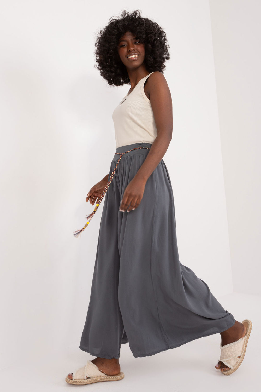 Viscose high-waisted pants, elastic waistband. Pants with wide legs, decorative tie belt.